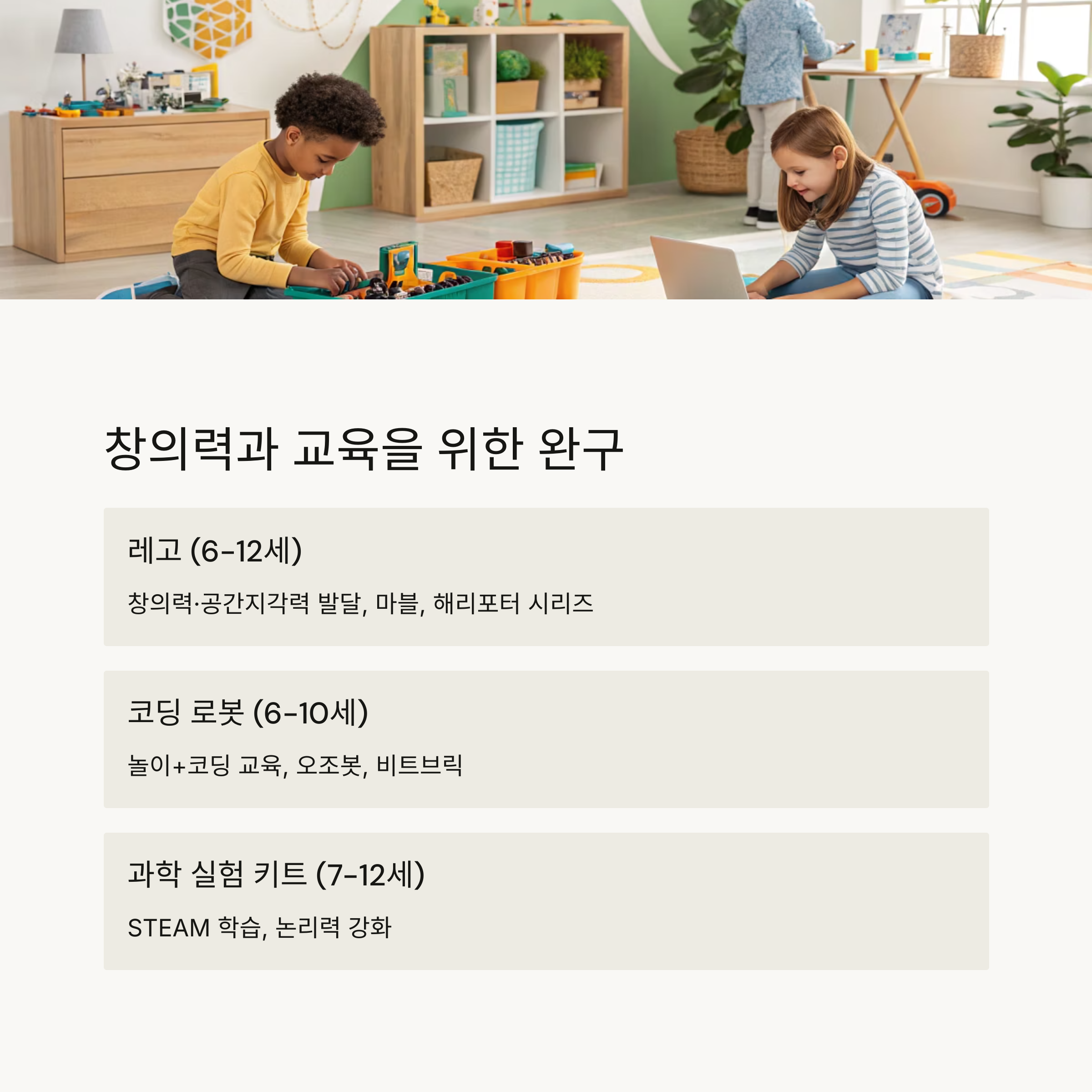 디지털 기기만큼이나 인기가 좋은 카테고리가 창의력과 교육을 함께 잡을 수 있는 완구입니다. 특히 레고, 플레이모빌, 코딩 로봇 같은 제품은 놀이면서도 학습 효과가 뛰어나서 부모님들도 선호하죠. 아래 표로 정리해드릴게요.